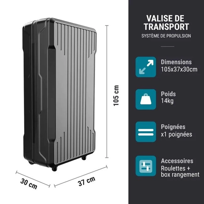 De SUP is eenvoudig op te bergen in de bijgeleverde rugtas met wielen. De elektrische motor kan opgeborgen worden in de meegeleverde opbergkoffer. Alles bij elkaar weegt het geheel minder dan 30 kg.