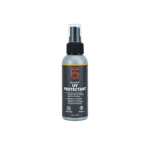 Revivex UV Protectant beschermt outdoor uitrusting tegen schadelijke uv-straling. Zonlicht kan een tent, kajak, dekluiken of kleding beschadigen en doen verkleuren. Of een product nu gemaakt is van nylon, plastic, rubber of glasvezel, de zon verminderd de kwaliteit. Deze gespecialiseerde formule blokkeert UV straling en herstelt het oorspronkelijke uiterlijk van de uitrusting door verloren weekmakers te vervangen. Hierdoor wordt de levensduur van het product aanzienlijk verlengt en daarnaast komt een deel van de oorspronkelijke glans en kleur weer terug.