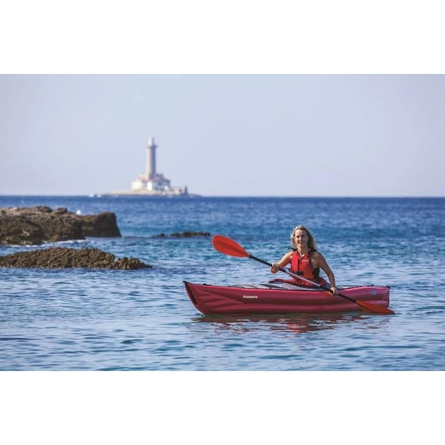 De Gumotex Framura is speciaal ontworpen voor (langere) tochten op zowel vlakwater als zee. Door zijn gestroomlijnde vorm en lengte van 410 cm snijd dit model snel door het water waardoor afstanden beter overbrugbaar zijn. De Framura heeft een opstaande neus waardoor deze kajak netjes over golven heen gaat in plaats van dat deze er doorheen prikt. Hierdoor wordt dit model minder geremd bij deining. Een andere mooie eigenschap is dat deze kajak volledig af te sluiten is aan de bovenkant middels een spatzeil. Deze past namelijk over de kuip van het vaste dek. Hierdoor wordt u en uw bagage niet nat van spatwater en warmt de lucht in de kajak op. Hierdoor leent dit model zich om te gebruiken in de koudere periodes. Optioneel is een roer welke bevestigd kan worden aan de achterzijde. Hiermee kunt u extra makkelijk tegen de wind of stroming in sturen. Alle modellen van Gumotex worden gemaakt van Nitrilon waardoor deze zeer stoot- en krasbestendig zijn!