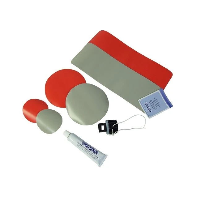 Gumotex reparatieset in twee kleuren met diverse patches, lijm, opbergdoos en Push-Push adapter.