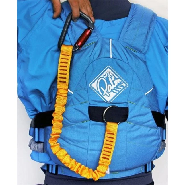 De Palm Cowtail One is een snel inzetbare elastische bevestiging welke bevestigd kan worden aan het PFD-harnassystemen. Hiermee kunnen kajaks aangehaakt worden of uzelf vastklikken aan reddingssystemen.